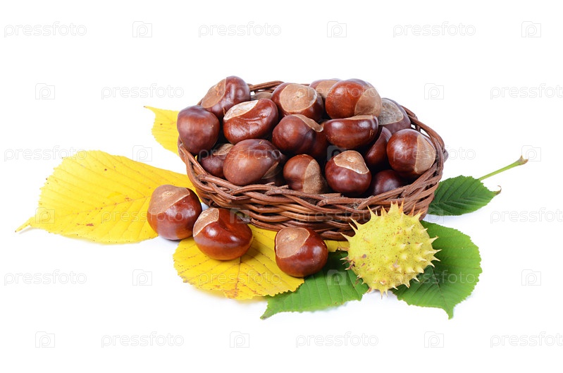 Каштаны на осенних листьях, изолированные на белом фоне