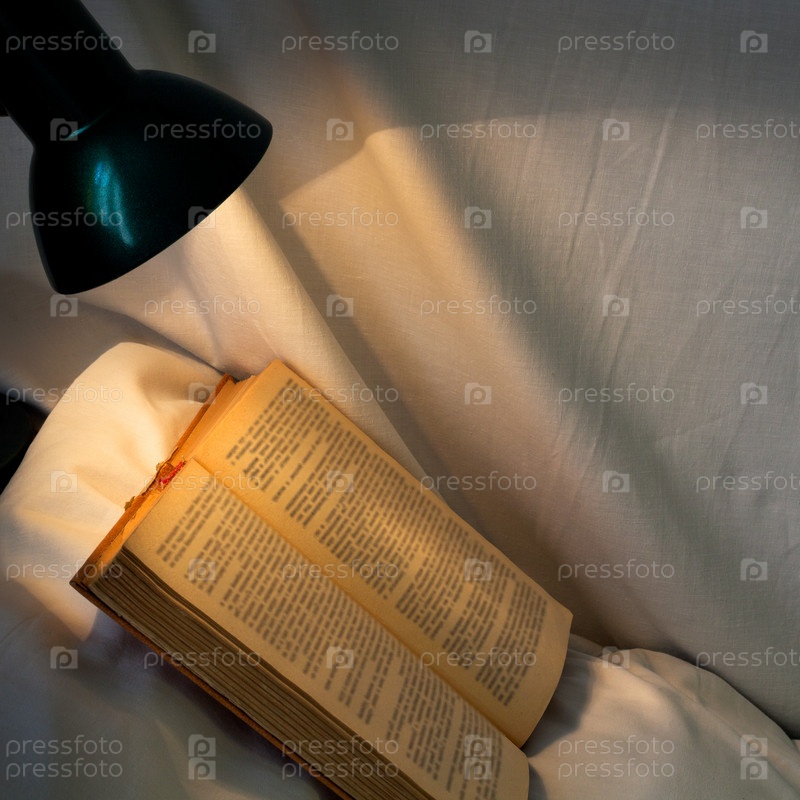 Книга на белой подушке и включенная настольная лампа