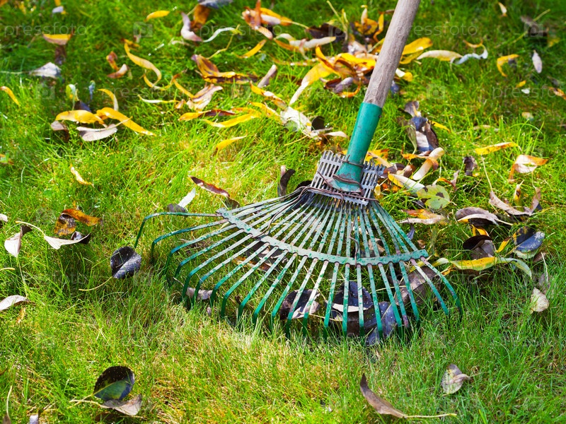 Уборка зеленой лужайки с помощью граблей