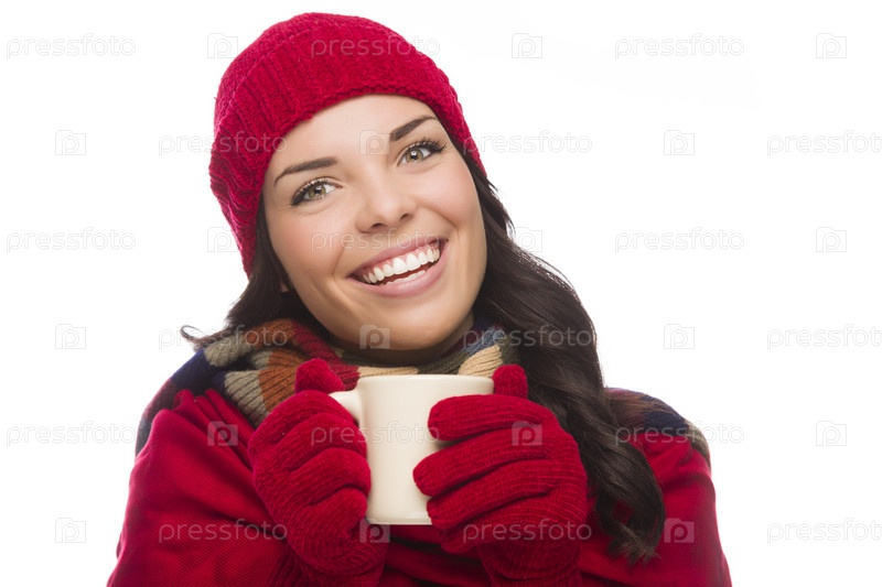 Женщина в перчатках с кружкой смотрит в камеру