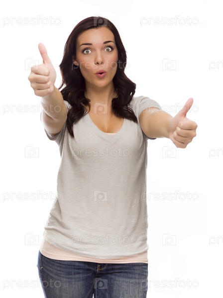 Модель с широко раскрытыми глазами показывает большие пальцы на белом фоне