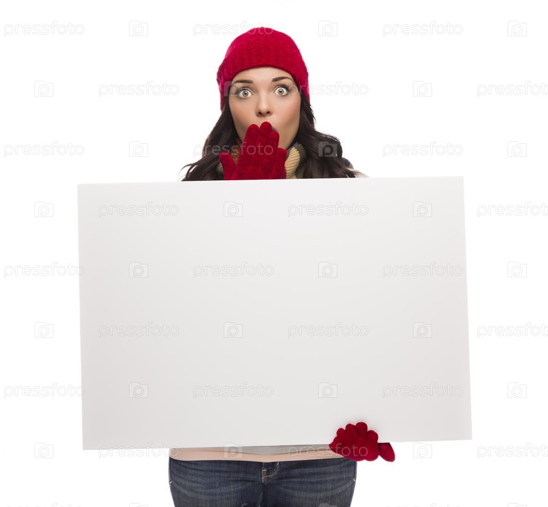 Радостная девушка в зимней шапке и перчатках держит чистую доску