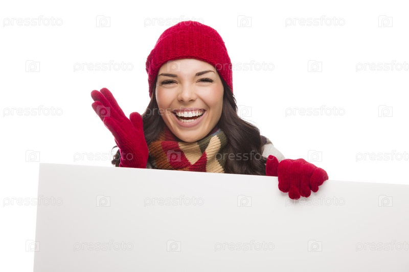 Радостная девушка в зимней шапке и перчатках держит чистую доску