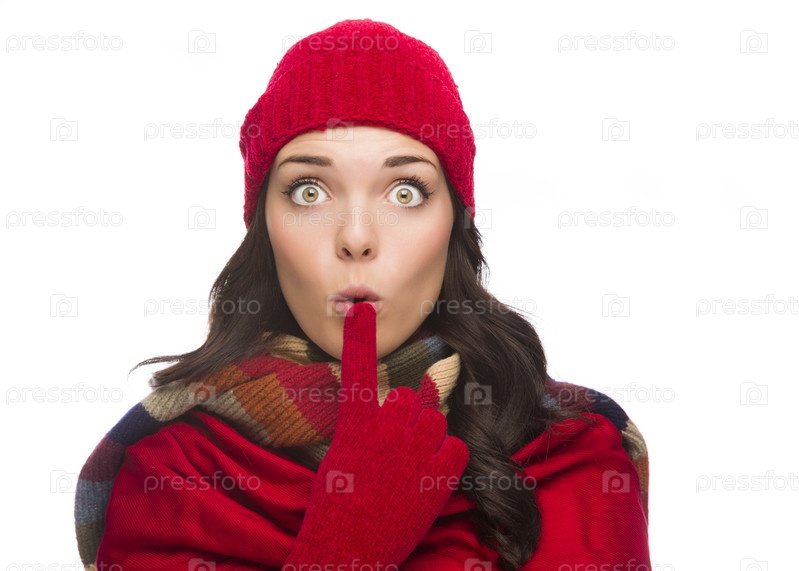 Удивленная женщина в зимней шапке и перчатках