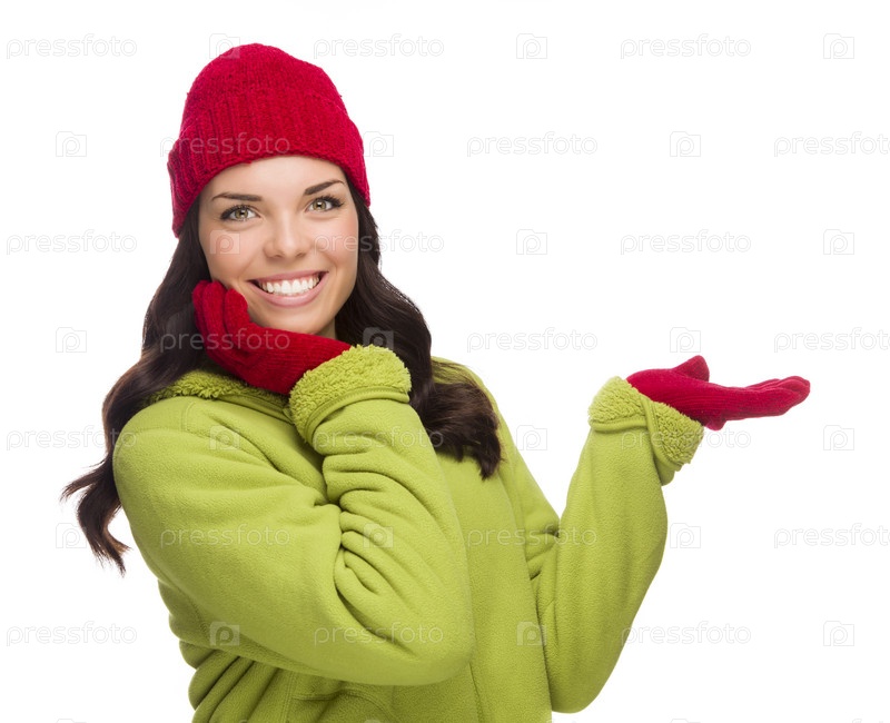 Женщина в варежках показывает в сторону