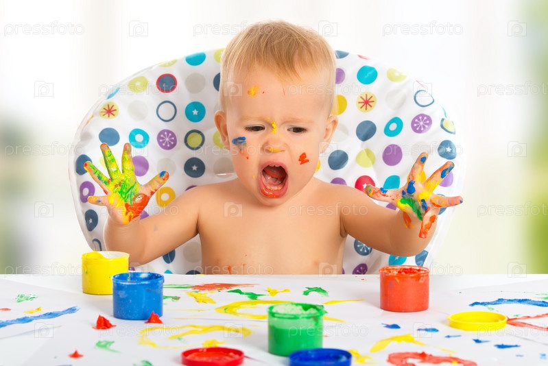 Счастливый ребенок рисует руками с помощью красок