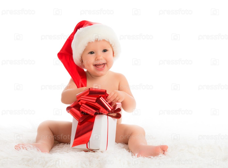 Счастливый малыш в рождественской шапке с подарком, изолированный