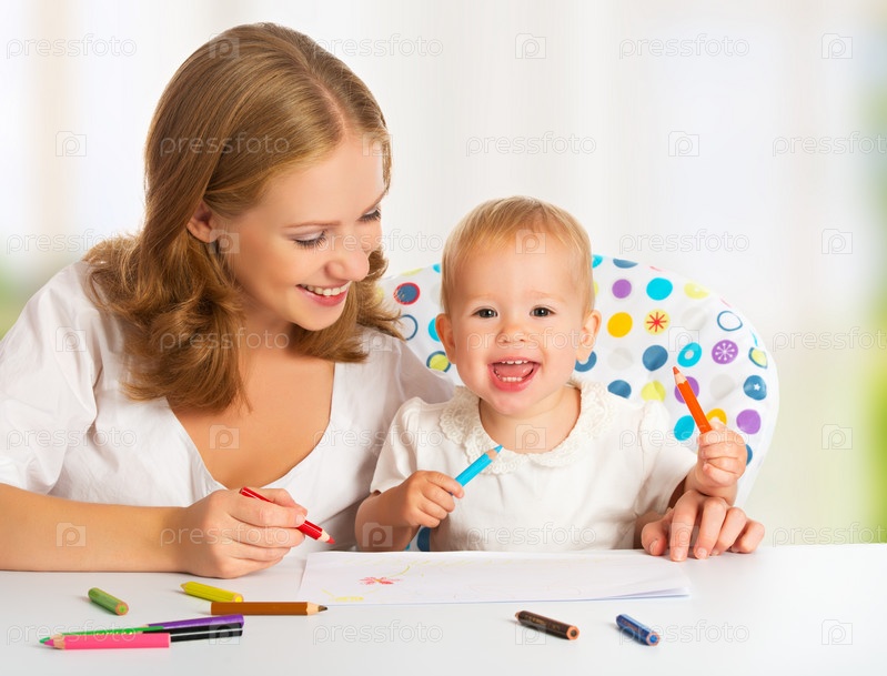 Мать и ребенок рисуют цветными карандашами