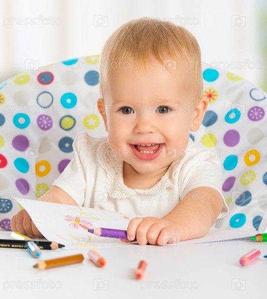 Счастливый малыш рисует с цветными карандашами