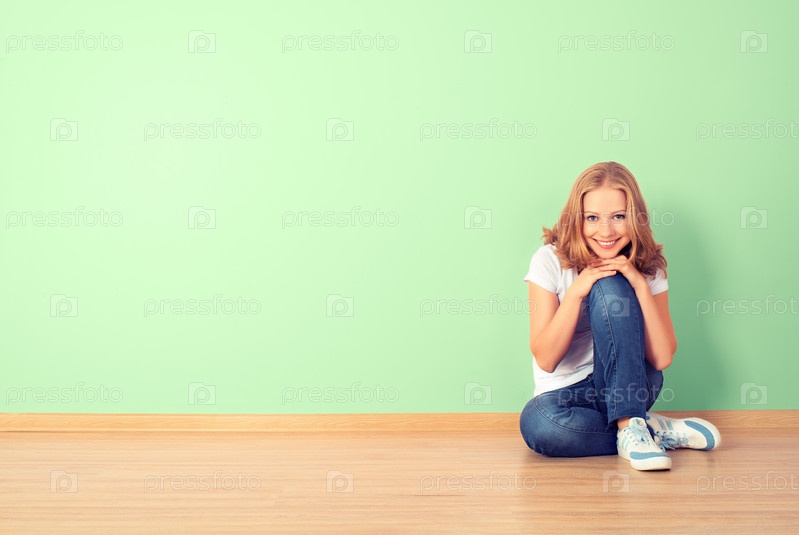 Счастливая женщина сидит в комнате у пустой стены