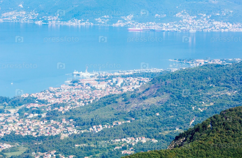 Которский залив в летнем тумане. Вид сверху. Черногория