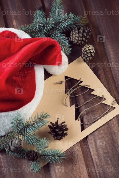 Рождественская открытка, шапка Санты, ветви пихты и шишки