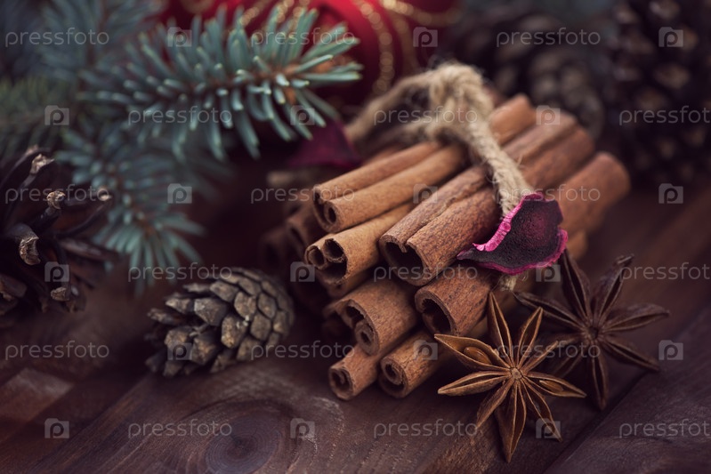 Связка палочек корицы, анис, еловые ветки и шишки