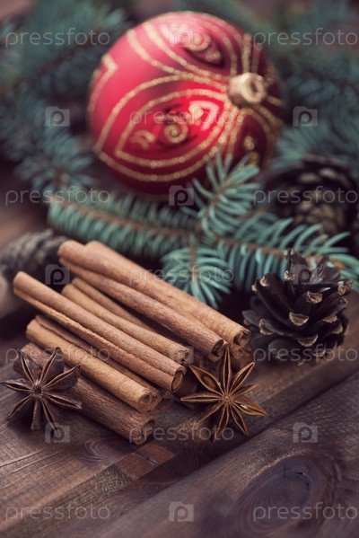 Палочки корицы, анис, ветви пихты и шишки