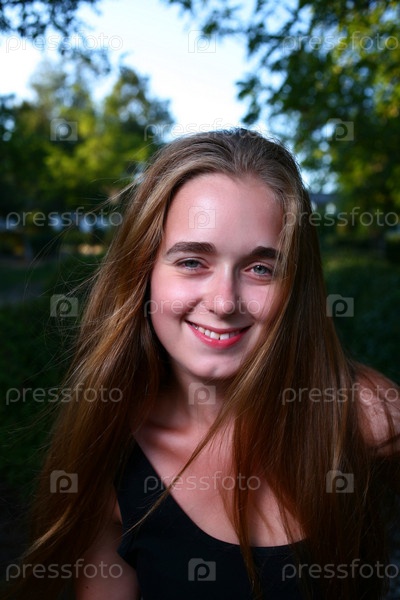 Красивая улыбающаяся девушка позирует на зеленом летнем фоне
