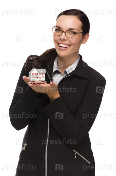 Счастливая женщина, держащая домик, изолированная на белом фоне