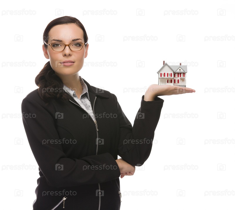 Счастливая женщина, держащая домик, изолированная на белом фоне