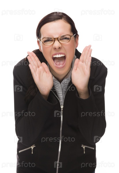 Злая бизнесвумен кричит на камеру, изолированная на белом фоне
