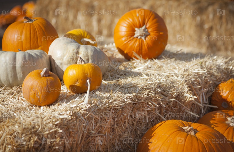 Свежие оранжевые тыквы на сене
