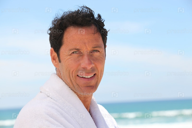 Мужчина в халате стоит на пляже