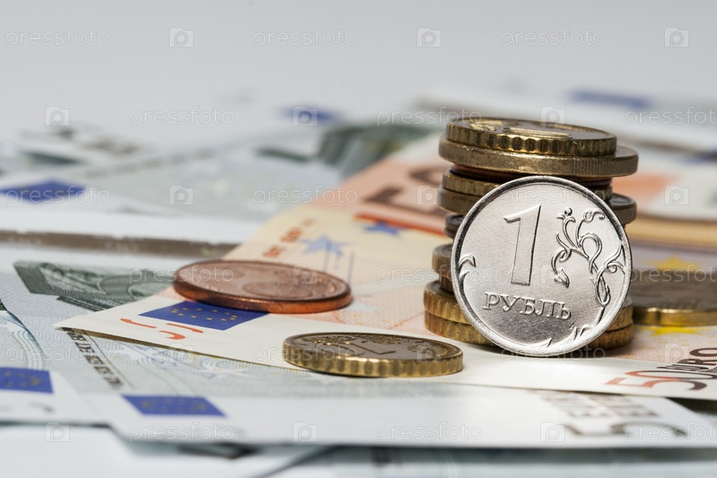 Один рубль и монеты и банкноты евро