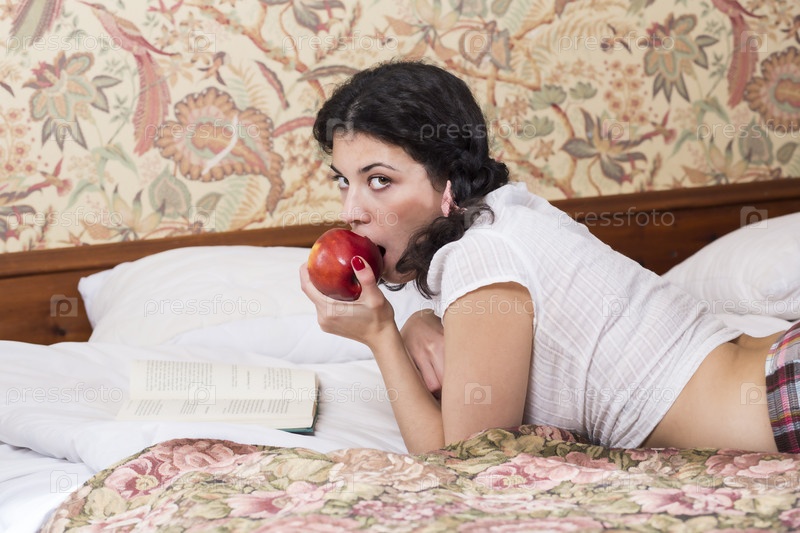 Женщина в школьной форме позирует с яблоком