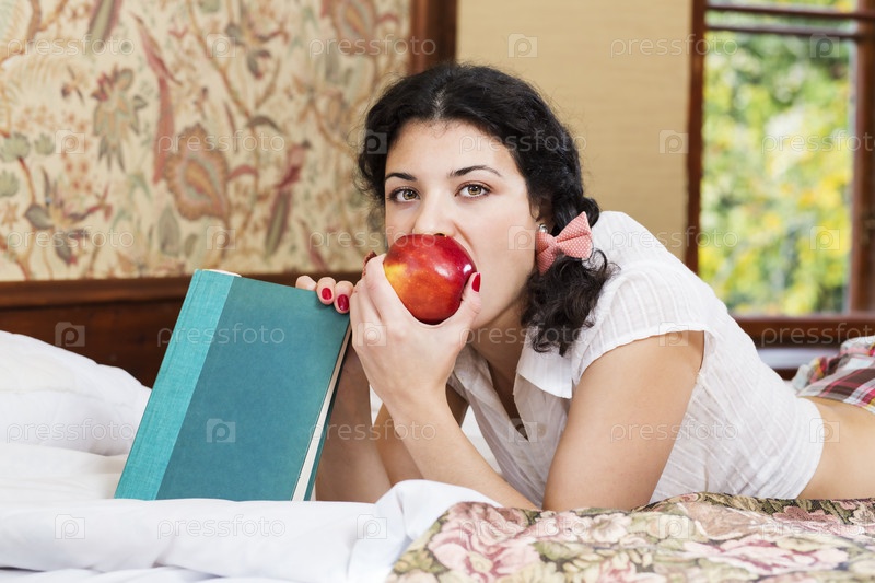 Женщина в школьной форме позирует с яблоком