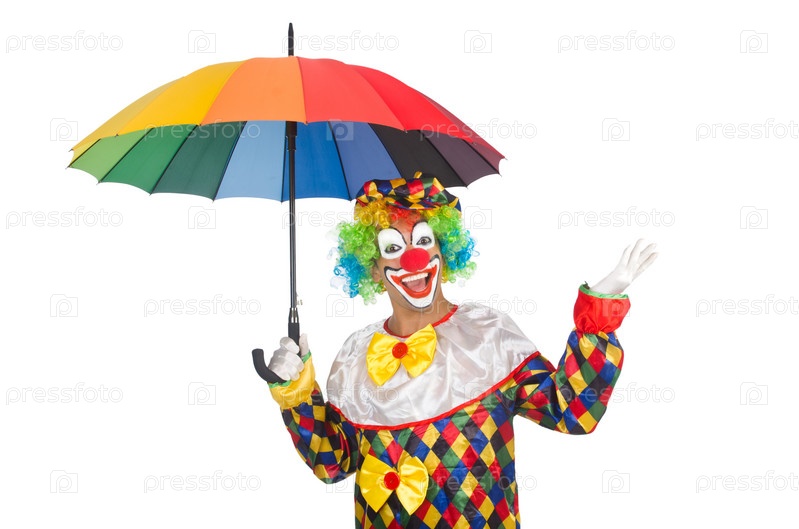 Клоун с зонтиком, изолированный на белом фоне