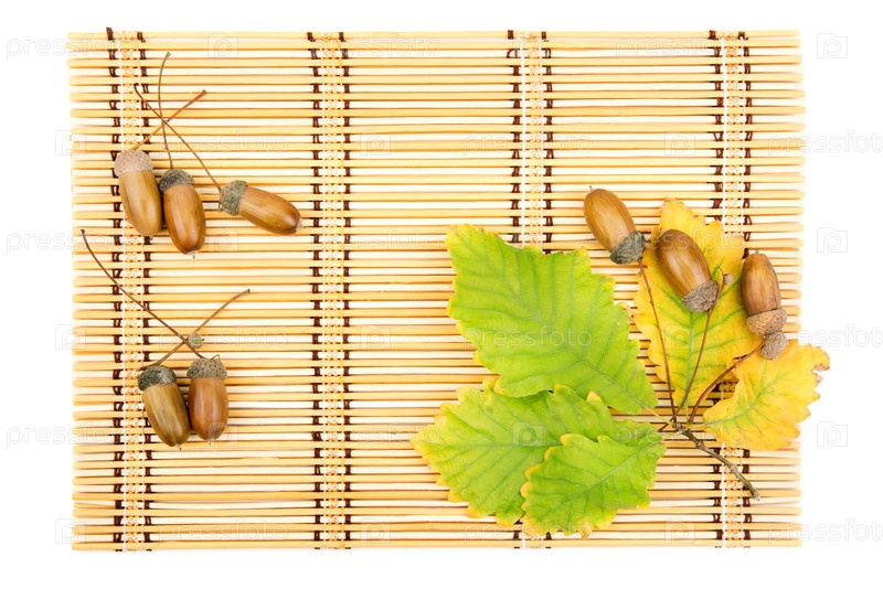 Дубовые листья и желуди на коврике из соломы