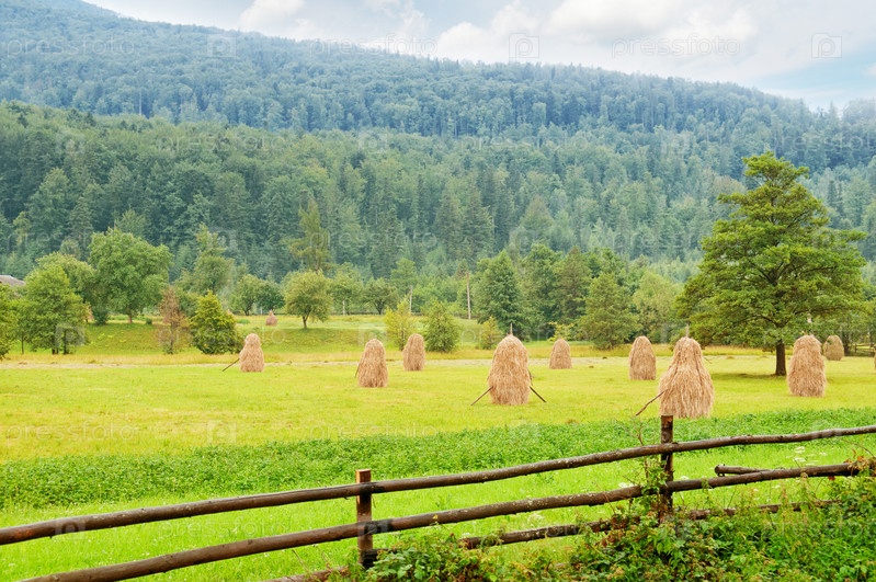 Стога сена в долине у Карпатских гор