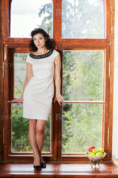 Женщина в красивом платье стоит на подоконнике