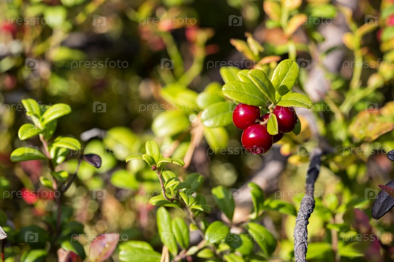 Спелая брусника на ветке куста