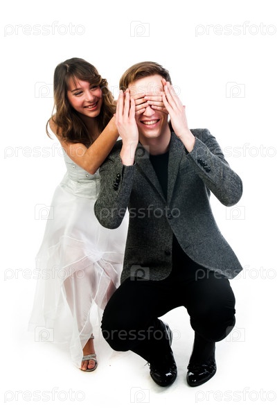 Женщина закрывает мужчине глаза руками