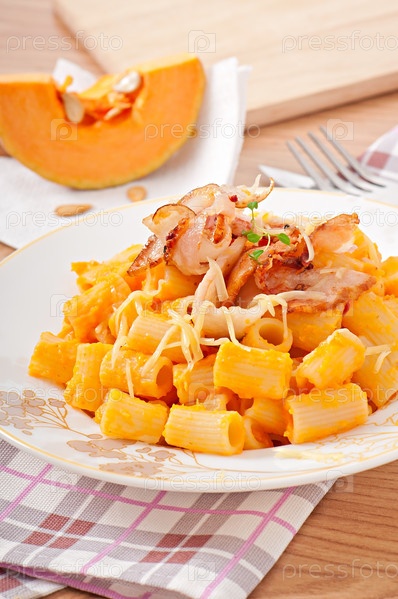 Паста «меццо Маника» с тыквой, ликером «Амаретто» и беконом