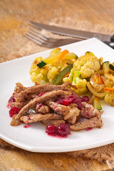 Бефстроганов с клюквенным соусом и овощами-гриль
