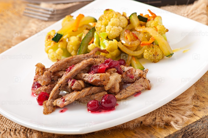 Бефстроганов с клюквенным соусом и овощами-гриль
