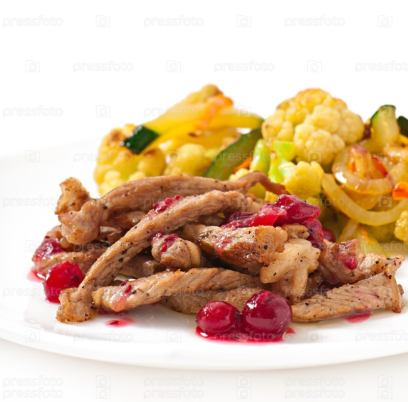 Бефстроганов с клюквенным соусом и овощами-гриль