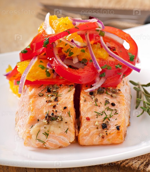 Запеченный лосось с салатом из сладкого перца и апельсинов