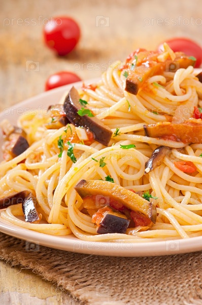 Спагетти с жареными баклажанами, томатами и кисло-сладким соусом
