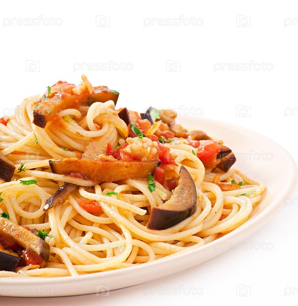 Спагетти с жареными баклажанами, томатами и кисло-сладким соусом