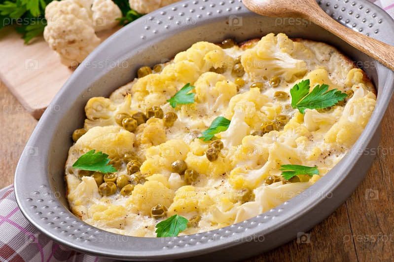Цветная капуста, запеченная с яйцом, сыром и зеленым горошком