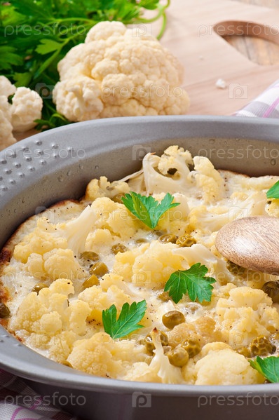 Цветная капуста, запеченная с яйцом, сыром и зеленым горошком