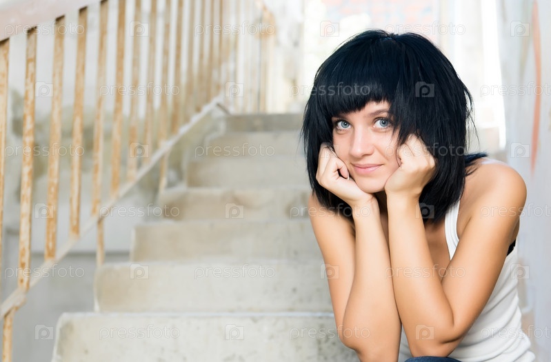 Улыбающаяся девушка сидит на лестнице