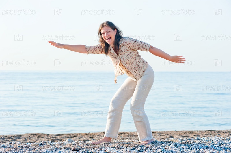 Девушка на пляже валяет дурака