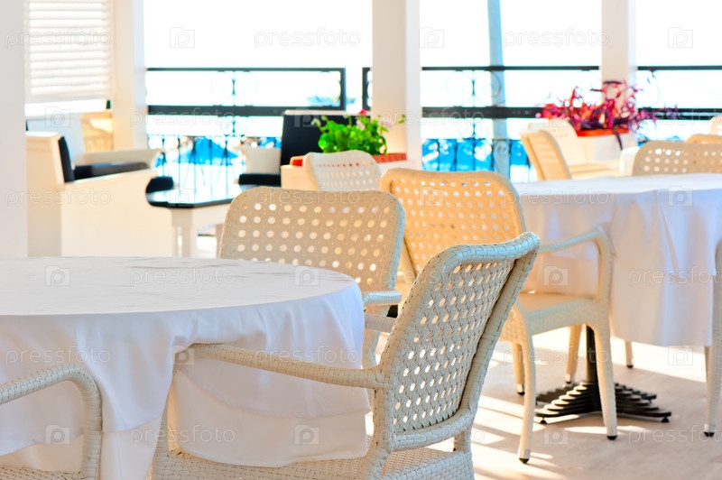 Стол, накрытый белой скатертью и плетеные стулья