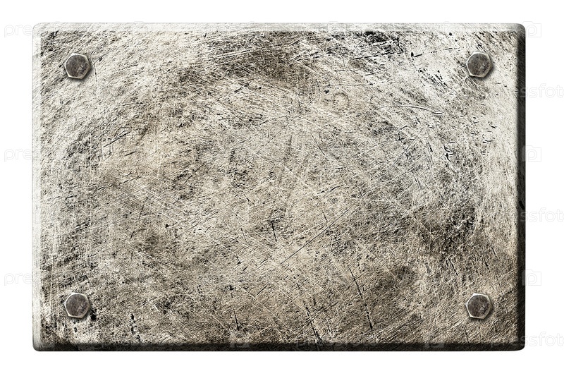 Старая поцарапанная металлическая пластина, прикрепленная четырьмя болтами, изолированная на белом фоне