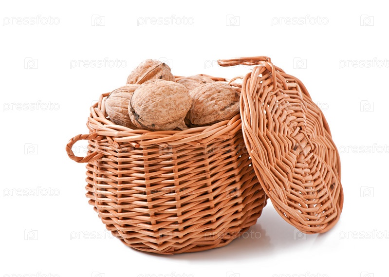 Корзина с грецкими орехами, изолированная на белом фоне