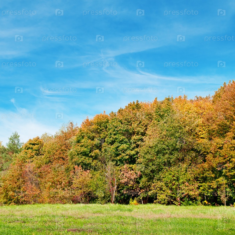 Осенний лес, зеленый луг и голубое небо