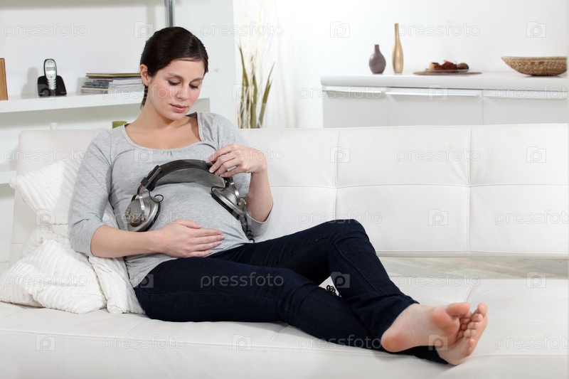 Беременная женщина на диване с наушниками