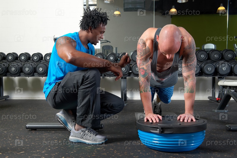 Мужчина с тренером в тренажерном зале